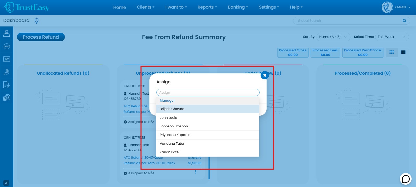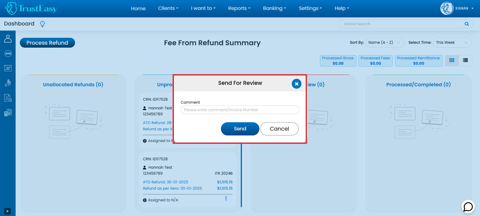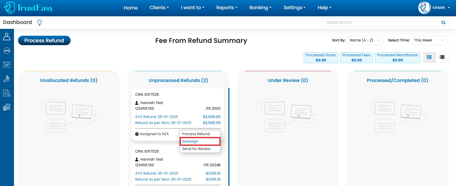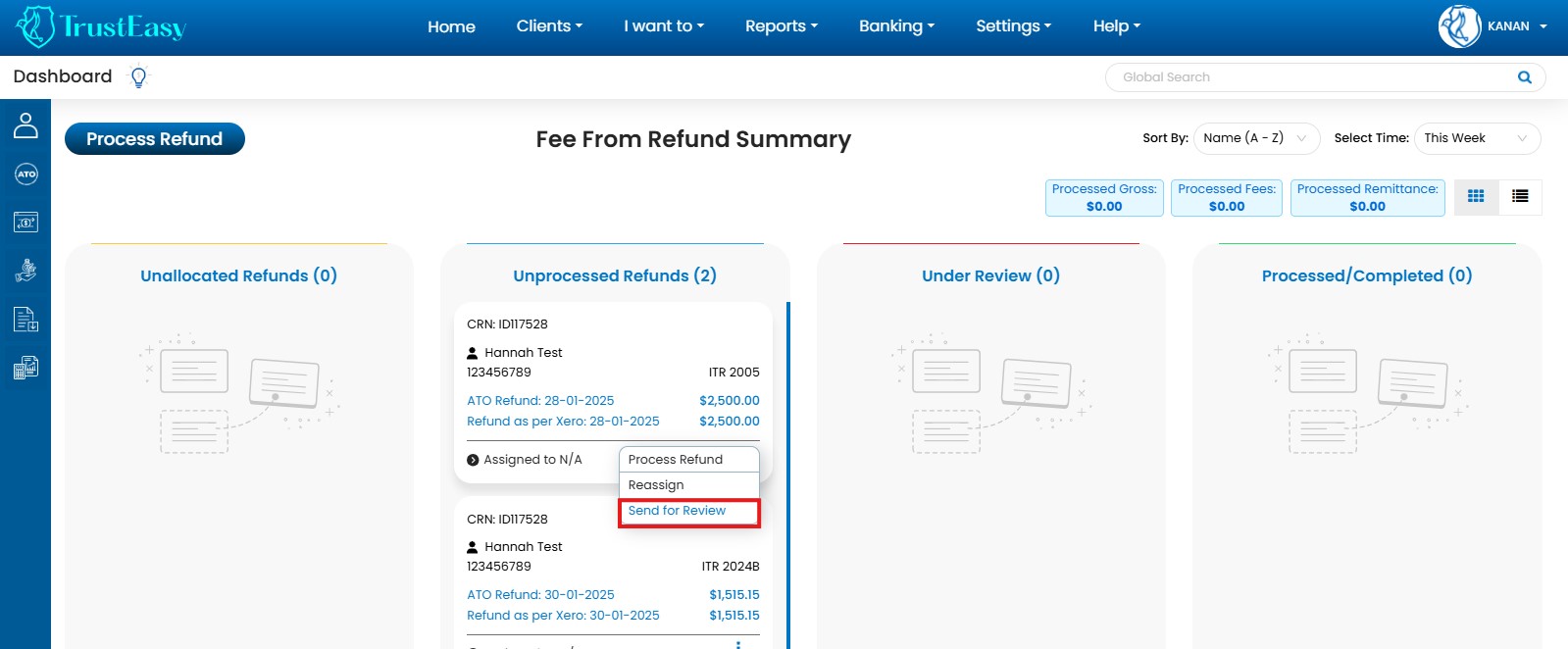 TrustEasy’s Home Page provides a user-friendly dashboard with KanBan and list views for efficient FFR(Fee From Refund) tracking: