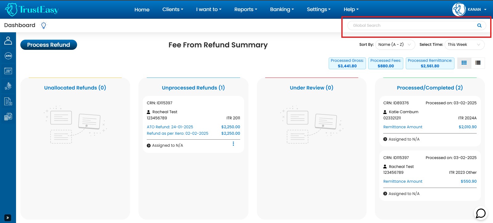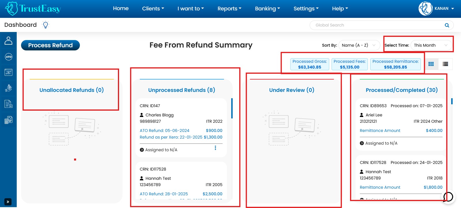 - Unallocated Refunds: Displays refunds processed by the ATO but not yet allocated to clients.