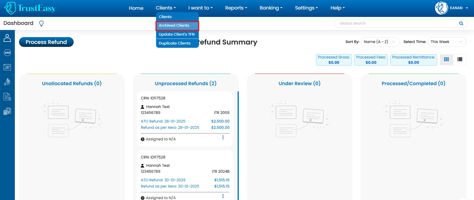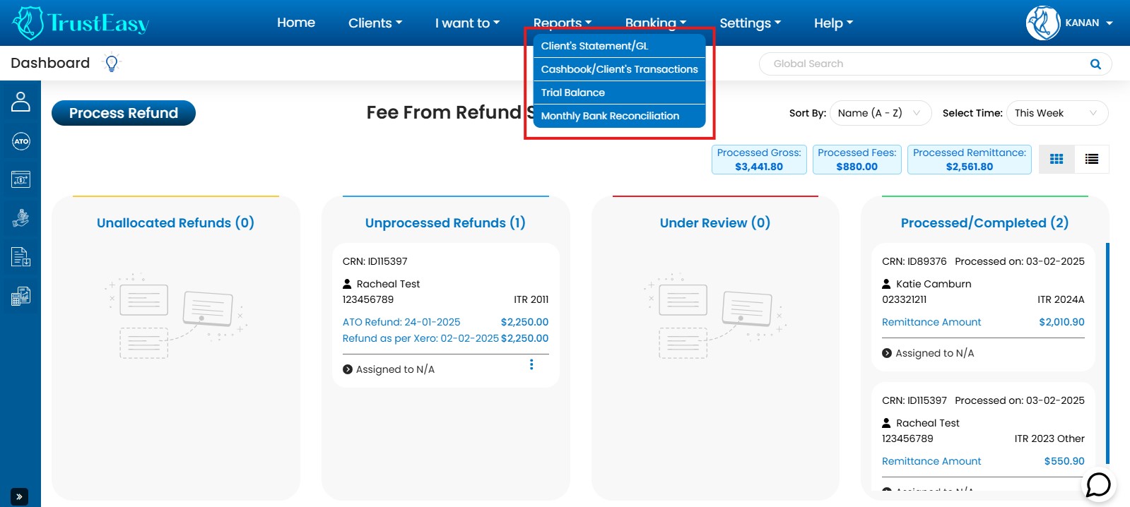 - Unprocessed Refunds: Shows refunds processed by the ATO, ready for client disbursement(processing and payment to clients).